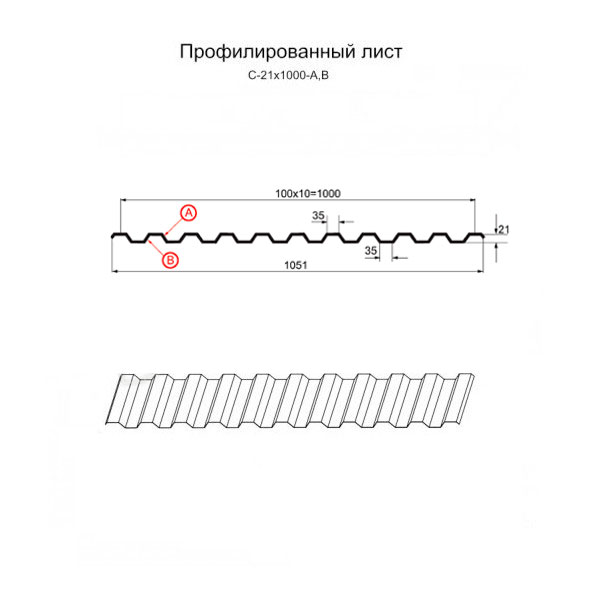 Профлист с маркировкой С-21 следует понимать, как «стеновой» вариант с глубиной профиля 21 мм. Тем не менее, С-21 – один из наиболее многофункциональных стройматериалов, применяемый не только для фасадов. Он будет уместен как для облицовки стен, так и для обустройства кровли, установки заборов. С успехом С-21 находит применение в строительстве складских помещений, торговых павильонов, быстровозводимых зданий, а также как элемент сэндвич-панелей. С-21 отлично подходит в качестве стройматериала для. Этому способствует его хорошая несущая способность. Довольно близко расположенные трапециевидные волны обеспечивают ему необходимую жёсткость. А пропорциональный рисунок профиля, идентичный с обеих сторон, придаёт гармоничный облик. В зависимости от назначения, мы изготовим профнастил С-21 с различной толщиной металла от 0,4 до 0,7 мм. Для увеличения срока эксплуатации и внешней привлекательности, профлист изготавливается в полимерных покрытиях различных цветов и фактур, включая покрытия под камень, дерево, кирпич.